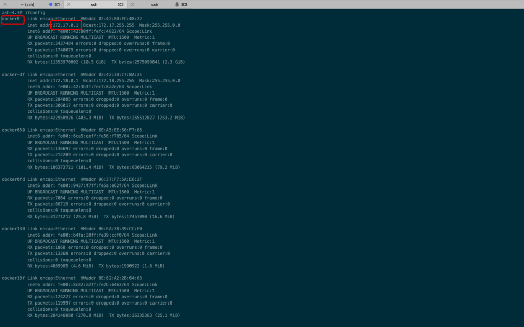 docker0ip代表宿主机的docker0地址。通过ifconfig命令查询,如下图