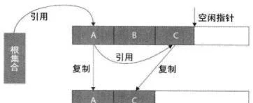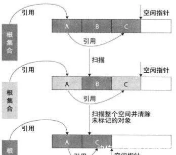 原理:从根集合节点进行扫描,标记出所有的存活对象,并将这些存活的对象复制到一块儿新的内存(图中下边的那一块儿内存)上去,之后将原来的那一块儿内存(图中上边的那一块儿内存)全部回收掉适用场合:存活对象较少的情况下比较高效扫描了整个空间一次(标记存活对象并复制移动)适用于年轻代(即新生代):基本上98%的对象是”朝生夕死”的,存活下来的会很少缺点:需要一块儿空的内存空间需要复制移动对象