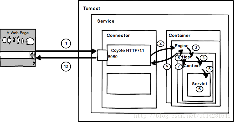 2、Connector把该请求交给它所在的Service的Engine来处理,并等待Engine的回应。